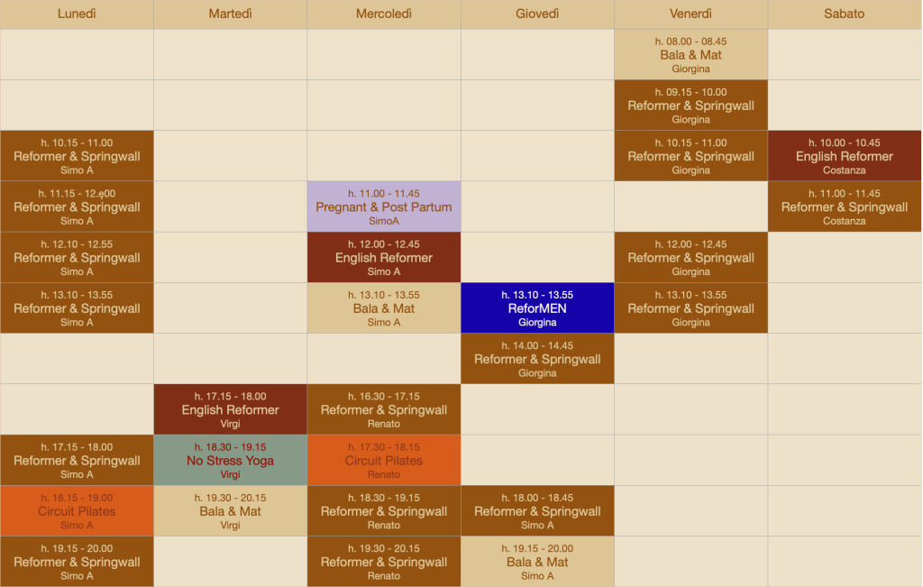 Palinsesto SCOPRI IL PALINSESTO LEZIONI [dall'8 settembre 2025. Gli orari potrebbero subire delle modifiche] [dall'8 settembre 2025] [gli orari potrebbero subire delle modifiche] Pilates Torino: via dei Mille 29/a - Torino